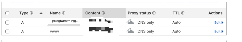 가서 레코드 A의 프록시 설정을 DNS Only로 바꾸어서
